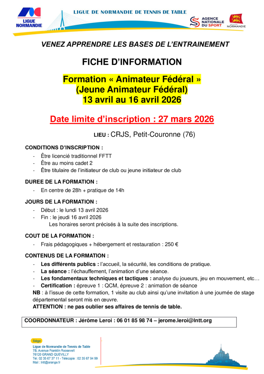 La ligue organise une formation d'animateur fédéral, du 13 au 26 Avril 2026 à Petit Couronne.