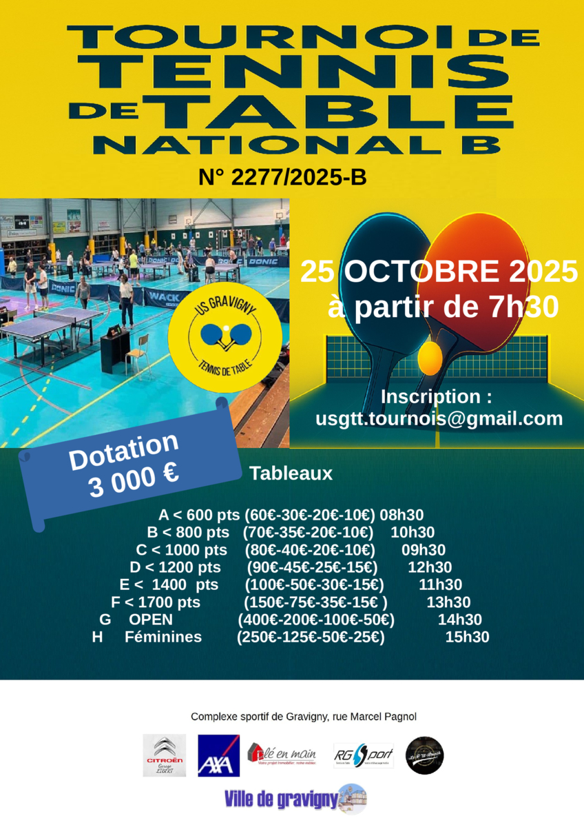 Tournoi de TT homologué le 25 Octobre 2025 à Gravigny.. Plus d'infos sur la rubrique "tournois"...