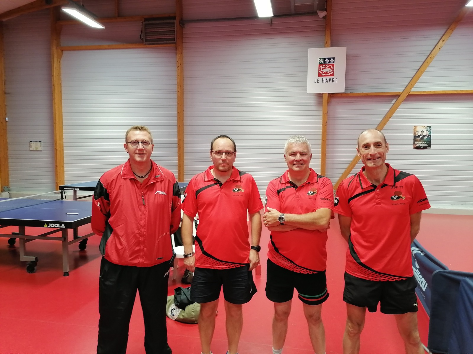 C’est désormais une habitude. La réserve fécampoise se déplace pour son premier match de poule, chez les havrais de l’ATT, le club phare de la région avec le SPO Rouen. C’est l’équpe 8 du club du mont gaillard que croisait ce vendredi les joueurs de Xavier Lemire. Défaits l’an passé, ils avaient l’espoir de mieux faire cette fois avec le renfort de David Guérin, qui s’imposera 2 fois tranquillement. L’opposition était moyenne pour une D1 emmenée par le jeune Morel (1368), qui restera invaincu avec 3 victoires + double face aux rouge et noir. Qui pour le coup avaient peu le droit à l’erreur face à des joueurs plus modestes classés 9 et 10. La bonne s’il en est une, est la performance de l’éternel Richard Coquais remontée en réserve pour palier aux absences. Avec 2 victoires sur Lemarquand et Morel, il permet de créer un écart juste avant les doubles (5-3 pour les uséfistes) . Le paire Guérin-Richardeau s’incline mais le victoire de Lemire et Coquais permet d’envisager un bon résultat.. Laurent Richardeau remporte une 2eme victoire dans la douleur, et Richard Coquais passe Lemarquand à la belle, apportant le point de la vitoire fécampoise ! Xavier Lemire parachève le score avec une victoire à l’arrachée sur Carel (10). 9-5 pour le quatuor fécampois, voilà qui débute une saison de la meilleure des façons. Dommage qu’il y ait tant de problème d’effectif….
